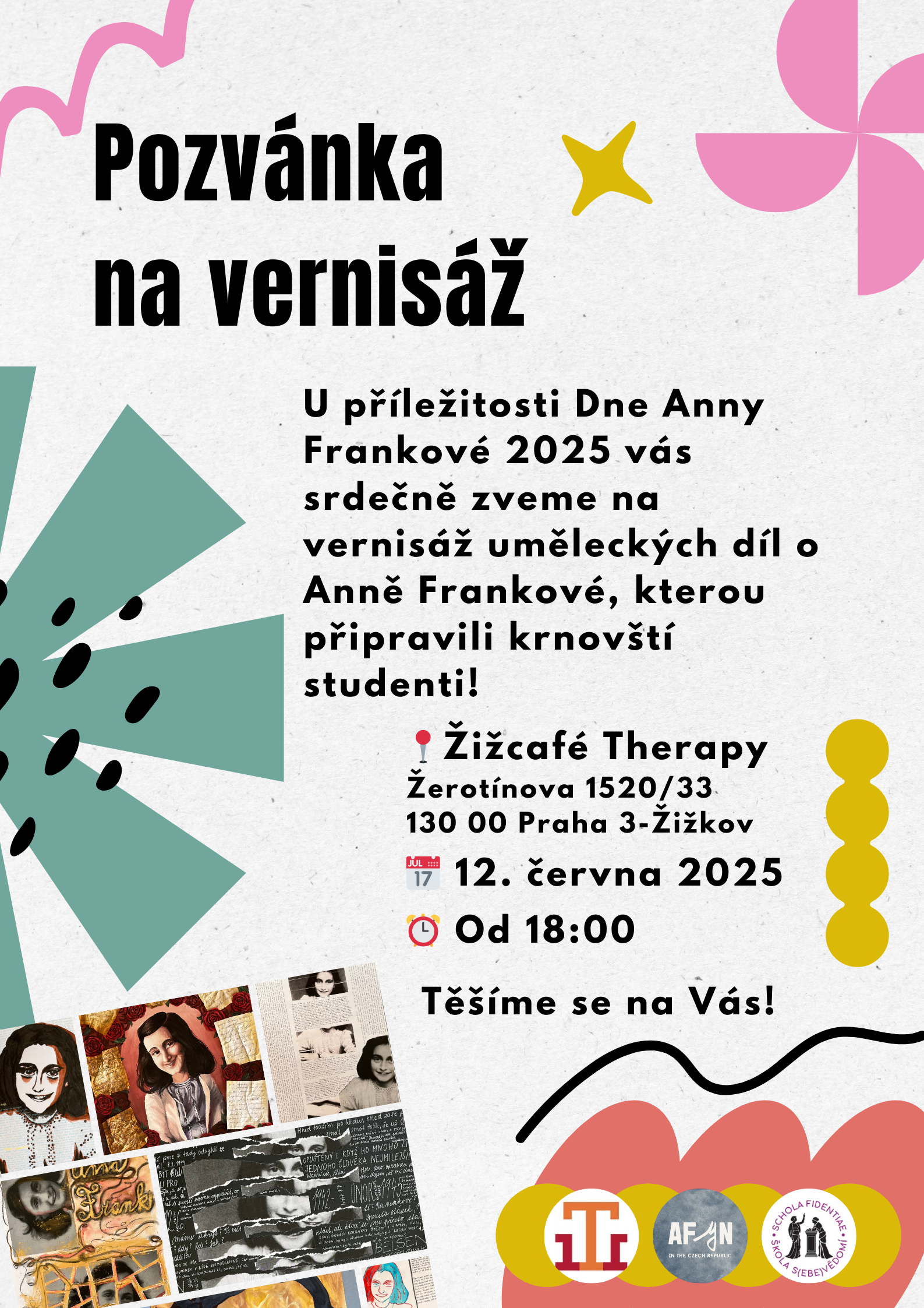 Pokud se vy nebo vaši studenti 12. ÄŤervna budete nacházet v Praze nebo okolĂ, budeme rádi, kdyĹľ se k nám pĹ™ipojĂte na vernisáži v Ĺ˝iĹľcafĂ© Therapy (Ĺ˝erotĂnova 1520/33, 130 00 Praha 3-Ĺ˝iĹľkov - mapy) od 18:00. Budete si moci prohlĂ©dnout nádherná originálnĂ dĂla talentovanĂ©ho Krnova. A pokud vaši studenti budou patĹ™it mezi šťastnĂ© vĂ˝herce, mĹŻĹľou si tam takĂ© vyzvednout svou cenu. Pozvánku jsme vám pĹ™iloĹľili k tomuto e-mailu, takĹľe ji nemĹŻĹľete minout!