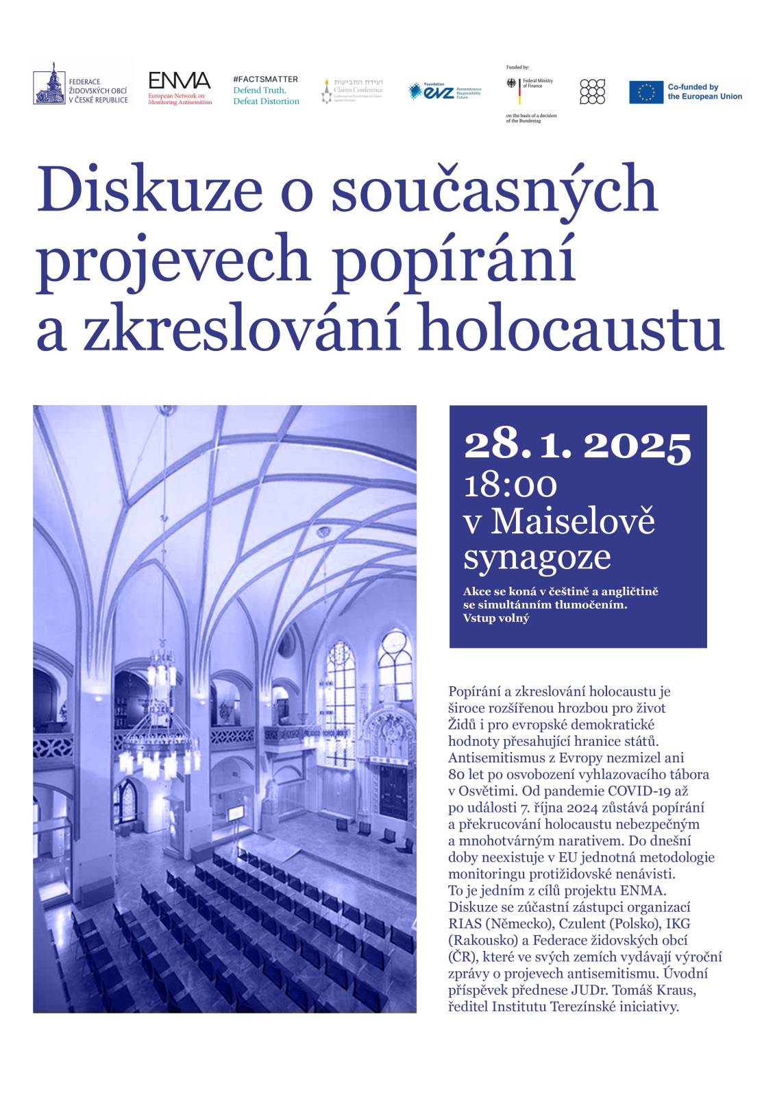Popírání a zkreslování holocaustu je široce rozšířenou hrozbou pro život Židů i pro evropské demokratické hodnoty přesahující hranice států. Antisemitismus z Evropy nezmizel ani 80 let po osvobození vyhlazovacího tábora v Osvětimi. Od pandemie COVID-19 až po události 7. října zůstává popírání a překrucování holocaustu nebezpečným a mnohotvárným narativem. Do dnešní doby neexistuje v EU jednotná metodologie monitoringu protižidovské nenávisti. To je jedním z cílů projektu ENMA. Diskuze se zúčastní zástupci organizací RIAS (Německo), Czulent (Polsko), IKG (Rakousko) a Federace židovských obcí (ČR), které ve svých zemích vydávají výroční zprávy o projevech antisemitismu. Úvodní příspěvek přednese JUDr. Tomáš Kraus, ředitel Institutu Terezínské iniciativy.