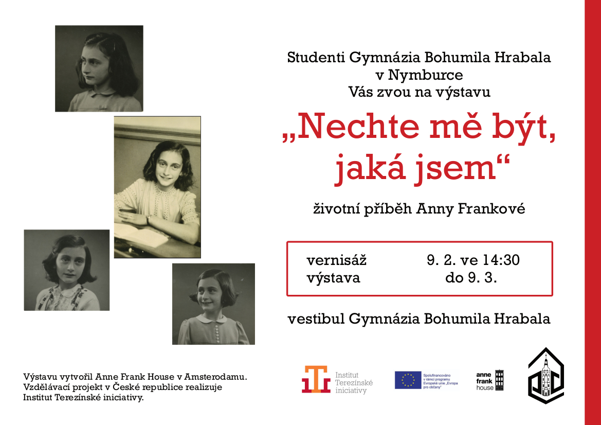 Do 9. března je výstava Nechte mě být, jaká jsem. Životní příběh Anne Frank k vidění na Gymnáziu Bohumila Hrabala v Nymburce. Rolí průvodců se ujali studenti a studentky z Klubu moderní historie.