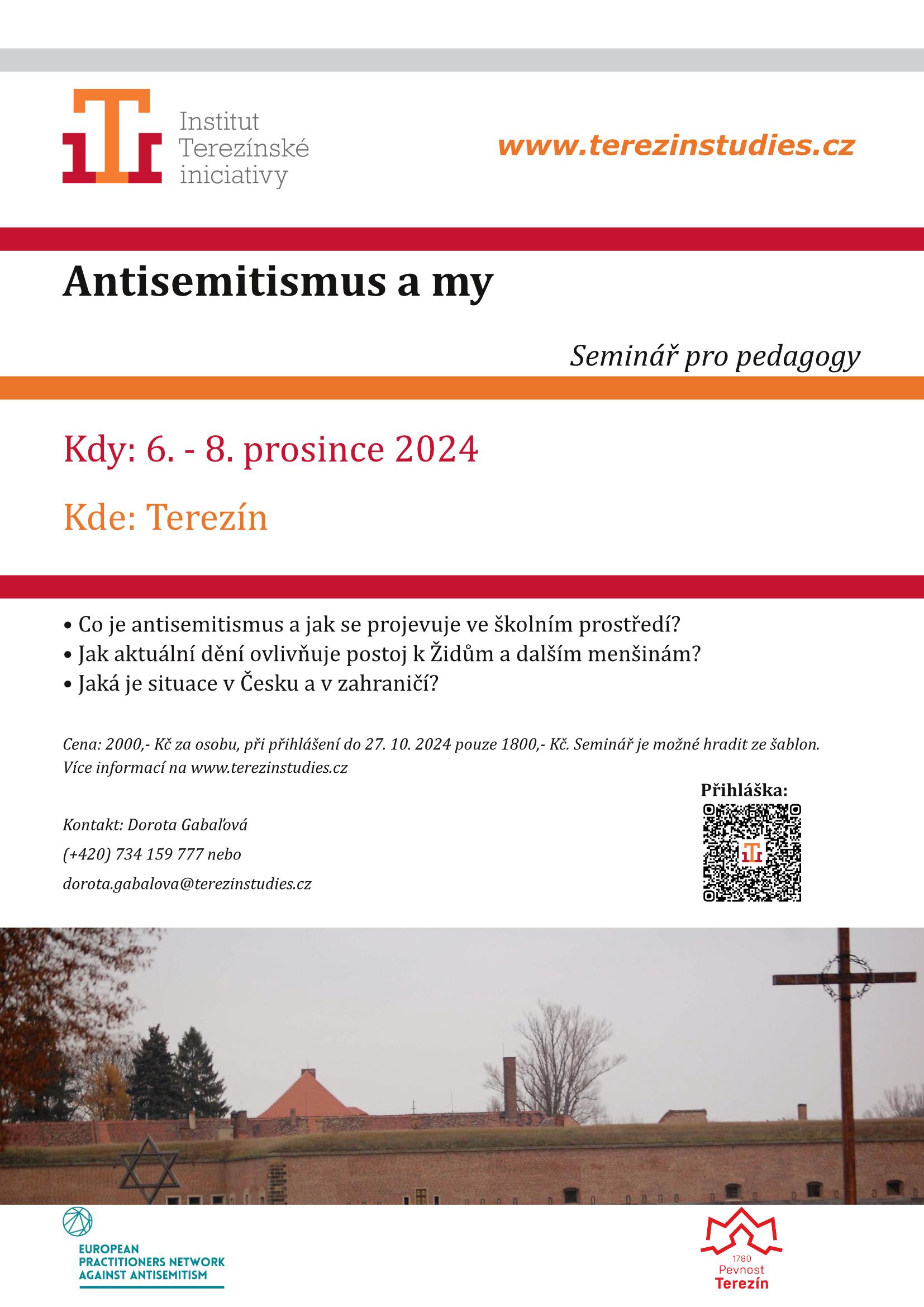 Srdečně vás zveme na seminář s workshopem „Antisemitismus a my“, který se bude konat od pátku 6. 12. 2024 do neděle 8. 12. 2024 v Terezíně.
